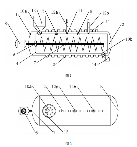 图中 :主壳体 1,微波单元 2,内腔 3,反应管 4,红外温度传感器 5,压力传感器 6,绞龙 7,电机 8,密封轴承 9,星形阀 10a,星形阀 10b,屏蔽网格 11,抽提管 12a,抽提管 12b,进料口 13,出料口 14。