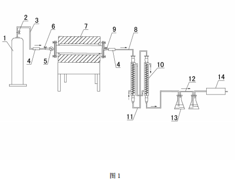 附图标记 :1 -氮气瓶、2 -减压阀、3—进气耐腐蚀导气软管、4—标准快速接头、5 -流量计、6 -进气气压阀、7 -管式回转炉、8 -出气耐腐蚀导气软管、9 -出气气压阀、10—冷凝器、11—乳胶管、12—玻璃导管、13—洗气瓶、14—活性炭吸附器。